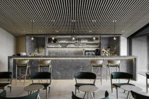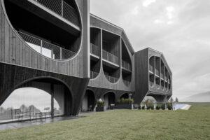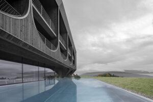 La nuova struttura alberghiera è suddivisa in quattro volumi sfalsati per spezzare la scala dell’intera struttura. Allo stesso tempo, la scala degli edifici circostanti deve essere rispettata. La composizione si ispira all’architettura tipica della regione e al classico fienile in legno – una reinterpretazione contemporanea.