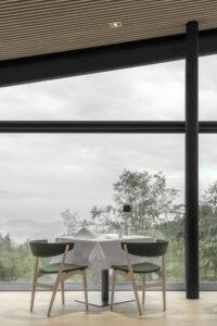 Il legno è il protagonista principale del progetto, sia all’esterno che all’interno. Crea un contrasto tra il legno annerito all’esterno e quello chiaro all’interno.