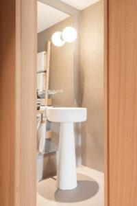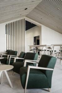 Gli interni sono semplici e funzionali, in uno stile alpino senza tempo. Il legno di frassino è abbinato ai tipici tessuti verdi di loden, che aggiungono un tocco di colore e riprendono la tavolozza naturale del paesaggio circostante.
