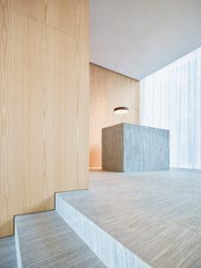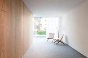 L’espressivo esoscheletro della facciata cambia a seconda dell’orientamento e del programma. Sulla facciata nord/est, nei corridoi e negli spazi pubblici, la struttura quasi scultorea forma una profondità minore.